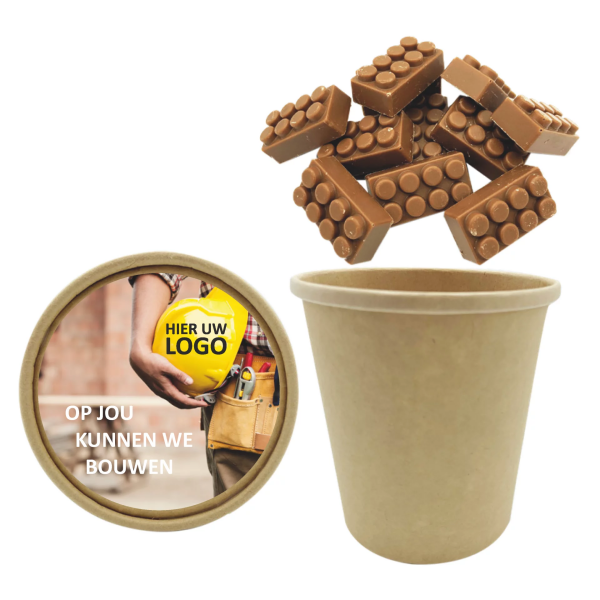 Snel leverbaar en altijd mooi te personaliseren. Kies je voor een biobeker met bouwsteentjes dan kan de deksel worden voorzien van een gepersonaliseerde sticker. Liever een doosje? Deze kan je personaliseren met een banderol!
