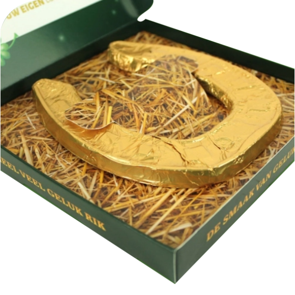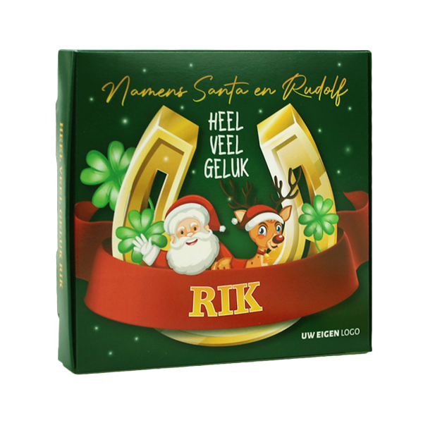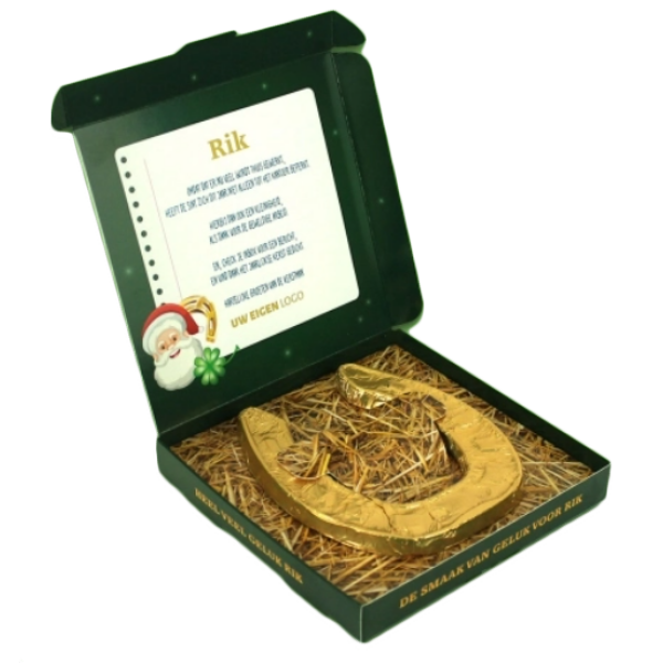 Een box om Kerstmis mee te vieren. De box is gevuld met een chocolade hoefijzer in goudfolie! Indien gewenst is deze box uit te breiden met keuze cadeaubon!
