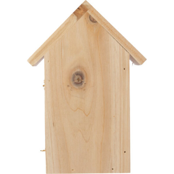 Grenenhouten vlinderhuisje met drie openingen aan de voorkant. Het huisje heeft een metalen ophanghaak om aan de muur te bevestigen. Individueel verpakt in een bruine kartonnen doos.