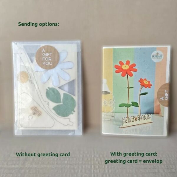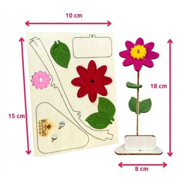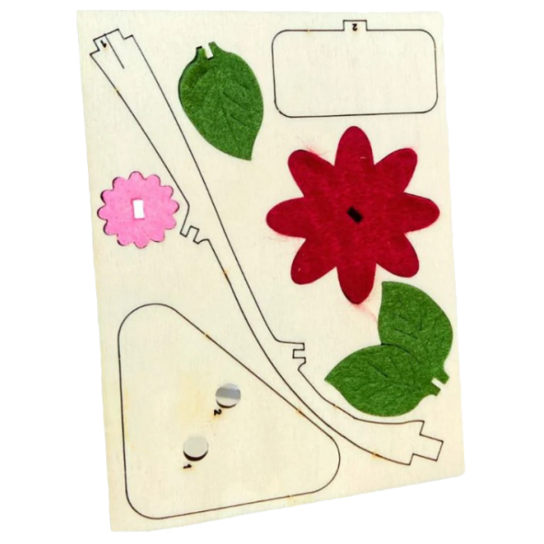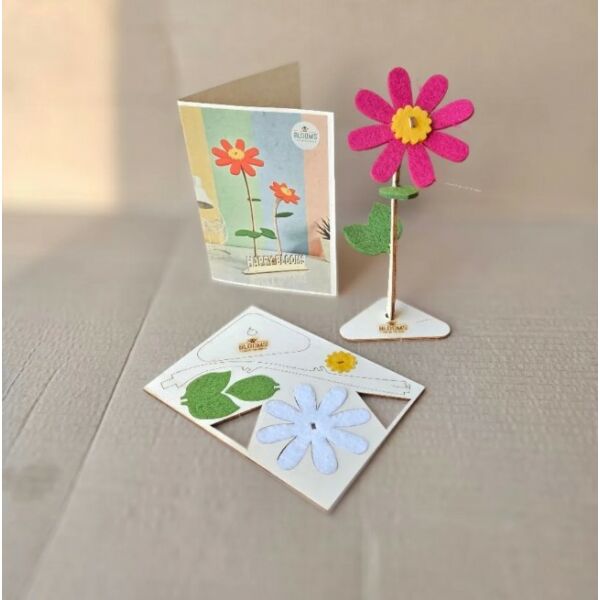 Dit vrolijke bloemcadeau is gemaakt van duurzaam hout en gerecycled vilt en bestaat uit een hout-en-vilten DIY-bloem, een houder en een gegraveerd logobordje, samengebracht in een houten kaart in A6-formaat.