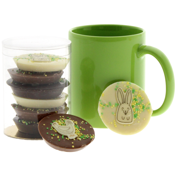 Lichtgroene keramische mok (300ml) met 150 gram ambachtelijk chocoladeflikken met paasopdruk (puur-wit-melk) in cilinder. Wil je de mok laten bedruk…
